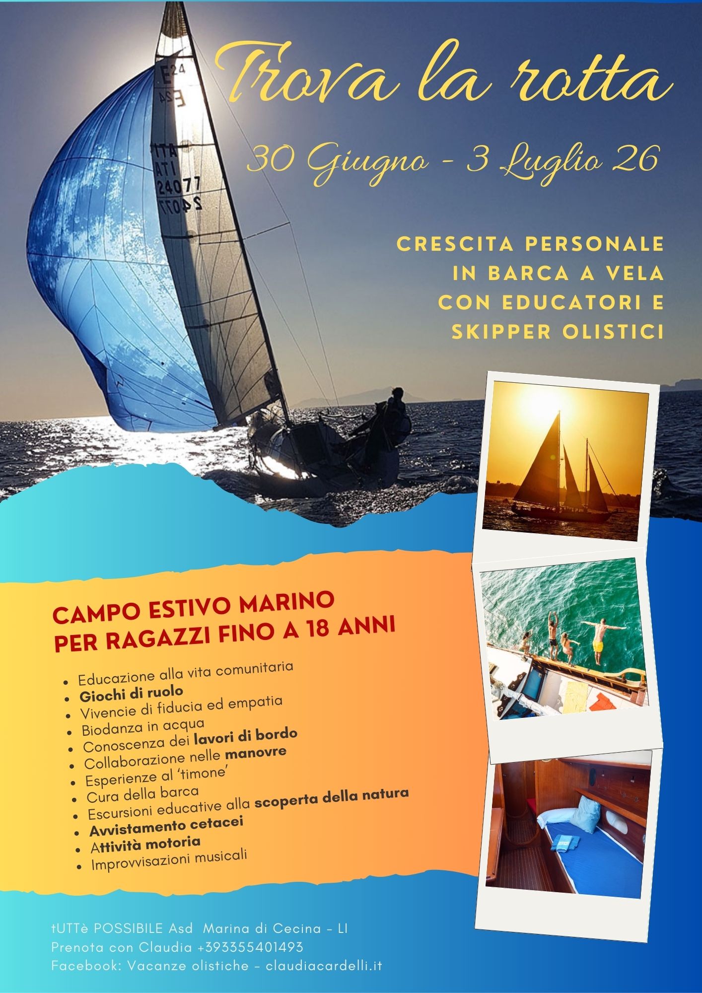 ![]() | TROVA LA ROTTA - Campo estivo in barca a vela per adolescenti La Barca è uno spazio ristretto, dove ognuno deve trovare il suo posto e rispettare quello degli altri, tutti hano un ruolo e devono sviluppare l'intuizione per fare anche ciò che 'non sembra' il pr... |