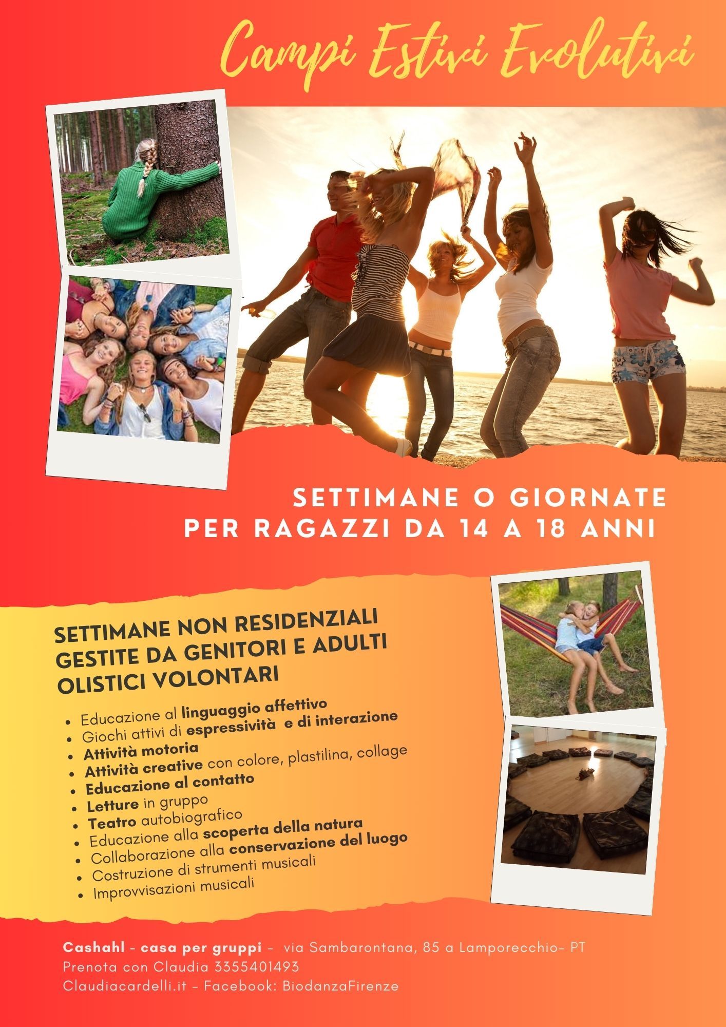 Il Campo estivo evolutivo prevede tante esperienze diverse ed è coordinato da un operatore fisso e poi genitori o operatori esterni che vogliono venire a fare compagnia, aiutare nella gestione del gruppo, contribuire all'organizzazione, a dare idee e proporre giochi. Gli adulti che collaborano sono o genitori, o praticanti di Biodanza e si attengono ai principi dell'Educazione biocentrica indicati dal coordinatore. Il Gruppo è aperto per adolescenti dai 13 ai 18 anni...