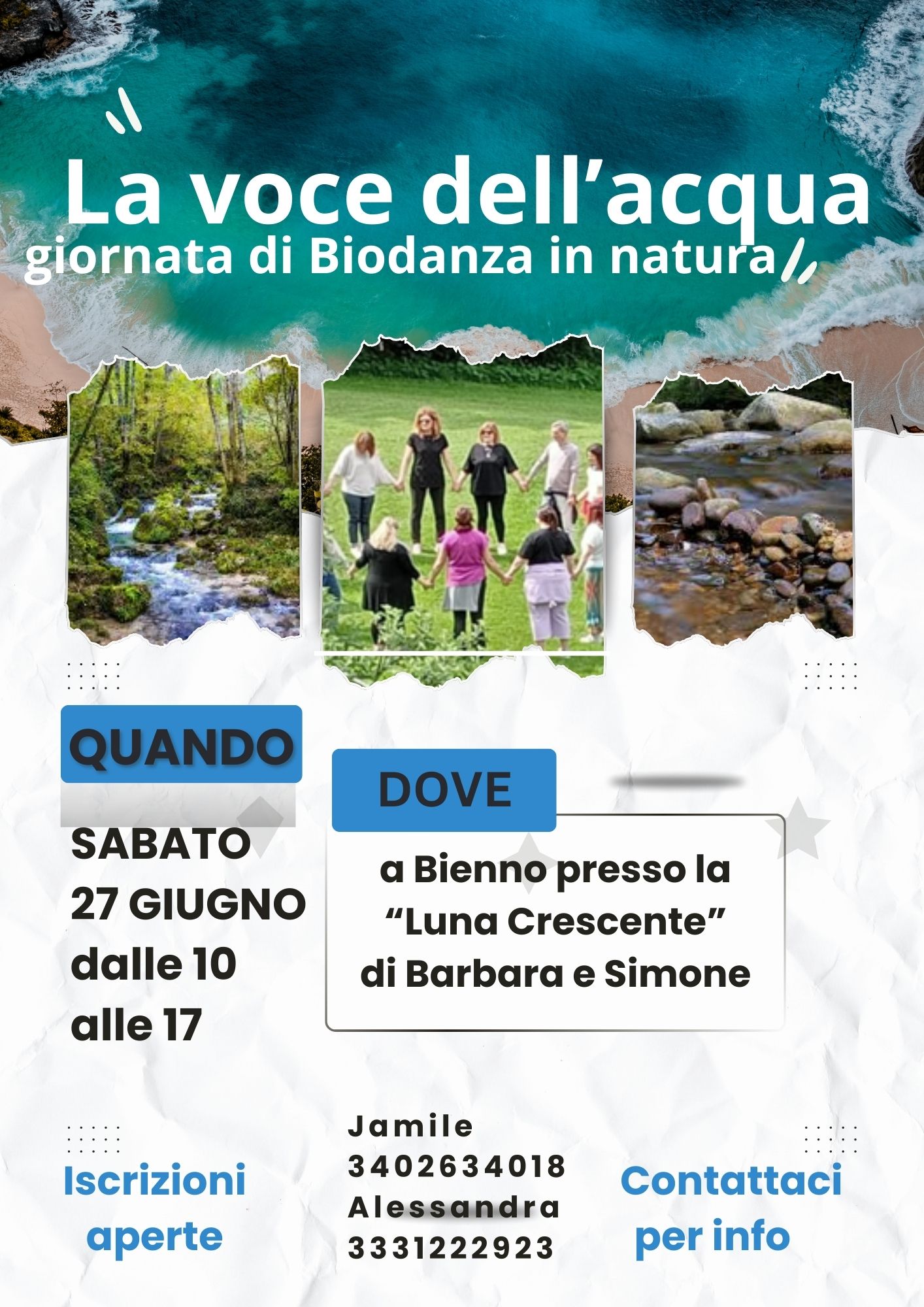 In questa giornata daremo voce all’elemento ACQUA con proposte e danze che ci possono aiutare a divenire più flessibili, aggirando gli ostacoli e adattandoci alle diverse situazioni, mantenendo però inalterata la nostra identità.