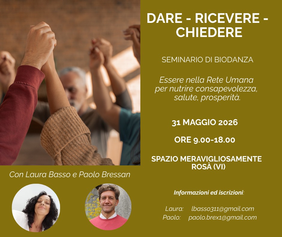 ![]() | Corso settimanale di Biodanza a Rosà (VI) con Laura Basso Quast'anno, da settembre 2025 a maggio 2026, danzeremo la Ruota dell'Anno alle ore 20,15 di ogni martedì. Il precorso è suddiviso in 3 moduli: il primo di 12 incontri fino a Natale, gli altri due d... |