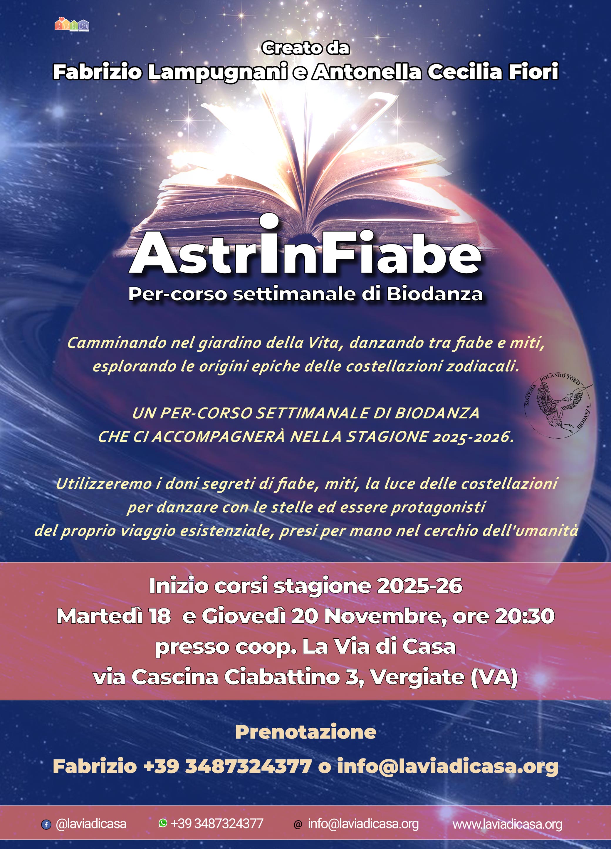 ![]() | AstrInFiabe Per-Corso settimanale (Martedi) di Biodanza a Vergiate (Va) con Fabrizio Lampugnani Camminando nel giardino della Vita, danzando tra fabe e miti,esplorando le origini epiche delle costellazioni zodiacali.UN PER-CORSO SETTIMANALE DI BIODANZACHE CI ACCOMPAGNERÀ NELLA STAGIONE 2025-202... |