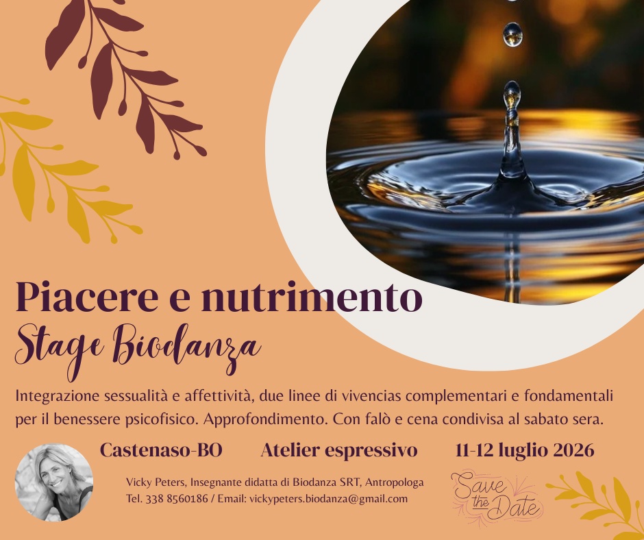 ![]() | Piacere e nutrimento, stage di biodanza, 11-12 luglio 2026, Castenaso (BO) PIACERE & NUTRIMENTO ✨ Due giorni di Biodanza per tornare al corpo, al cuore e alla vita. Cos’è la Biodanza? È un metodo esperienziale di crescita personale, che unisce musica, movimento e ... |
