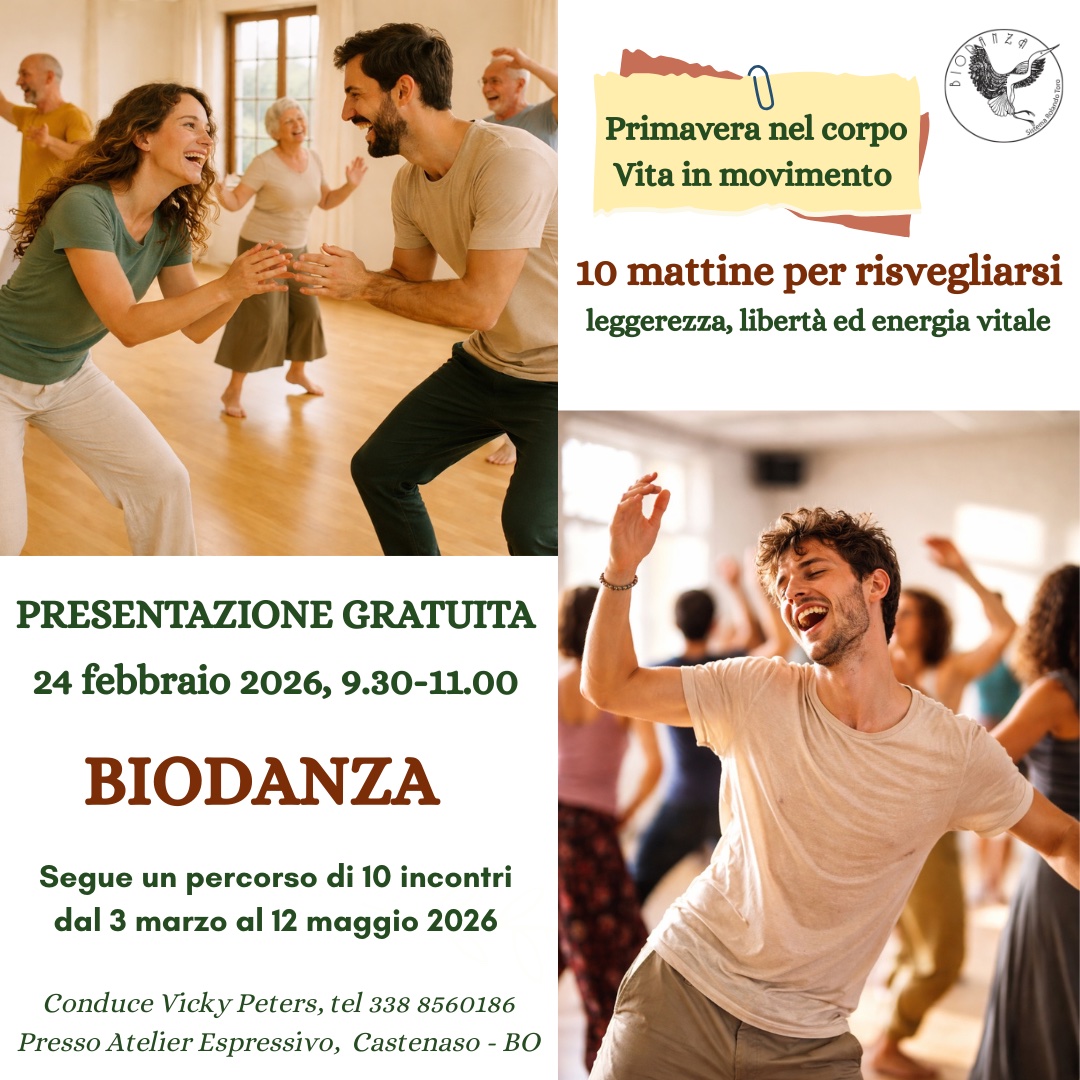 ![]() | Presentazione gratuita di biodanza, nuovo gruppo, 24 febbraio 2026, ore 9.30-11.00, Castenaso (BO) PRESENTAZIONE GRATUITA – NUOVO GRUPPO BIODANZA Hai voglia di ricaricarti, uscire dal guscio e ritrovare energia vitale? Biodanza è una pratica di benessere basata su musica, mov... |