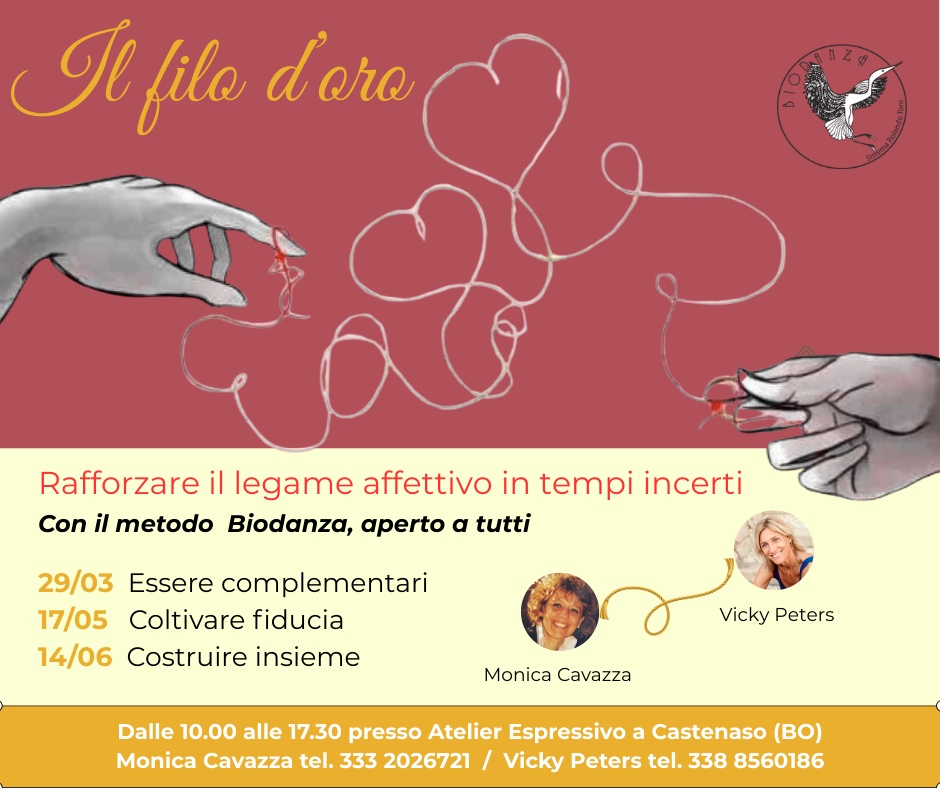 ![]() | Il filo d'oro, 3 giornate di biodanza per rafforzare i legami umani, 29/03 + 17/05 + 14/06 , Castenaso (BO) IL FILO D’ORORafforzare il legame affettivo in tempi incerticon il metodo Biodanza - 3 giornate - aperto a tutti In tempi di guerra, crisi e divisione, abbiamo bisogno di qualcosa di sempli... |